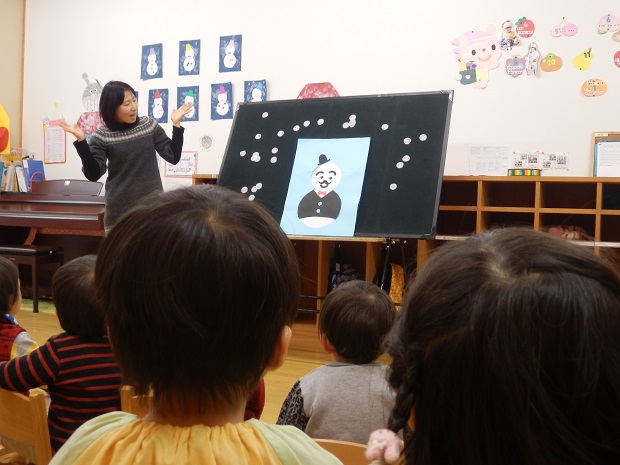 未満児のお友達は、つくしの保育室に集まり誕生会を行いました。アトラクションには雪太郎君が登場しました。
