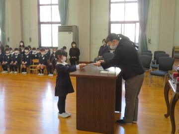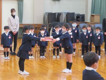 年長さんの代表園児が記念品の目録を園長先生に渡しました。