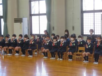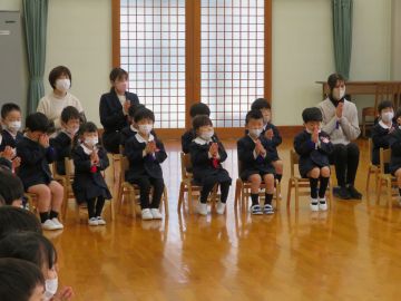 3歳以上児が本堂に集まり、卒業をお祝いする会を行いました。