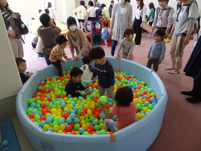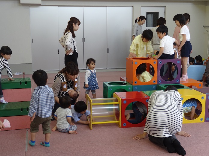この日は年長さんが遊びに加わってくれ、様々な遊びの場を提供したり、遊び方を示してくれたりしました。年間通して、様々な遊びを未就園の子どもたちに提供していきます。