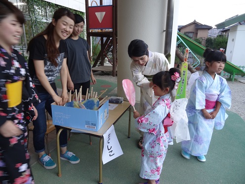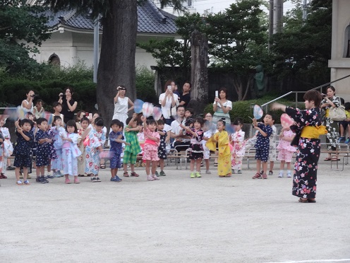 子ども達は保護者と一緒に、いつもと違うお支度で園庭に集まり、この日のために自分たちで和紙を染めて作ったうちわを受付で受け取りました。