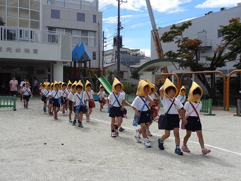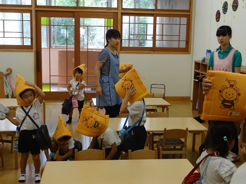 降園支度を始め、帽子の代わりに防災クッションを被ります。落ち着いて園庭に避難。
