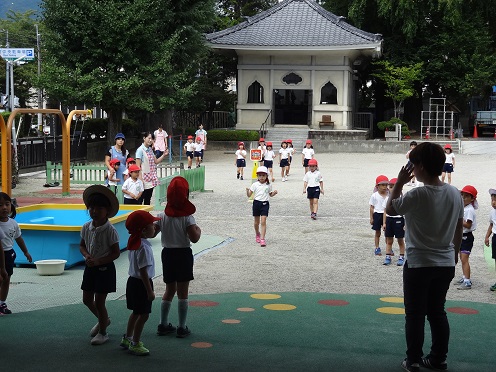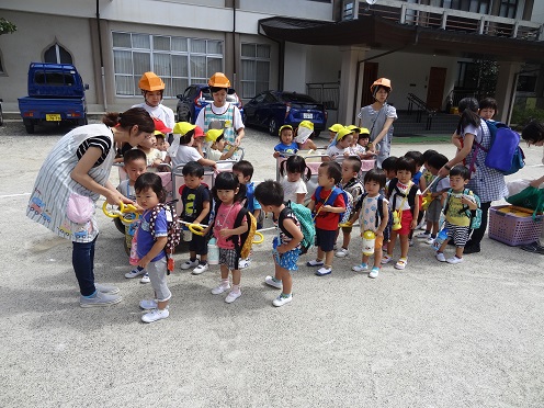 未満児さんはまず、みんなで落ち着いて庭に出て、それから防災クッションを被ったり、被せてもらったりしました。
