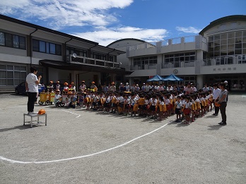 「警戒宣言受理」の放送が入り、遊んでいた子どもたちは手をとめ、一斉に放送に耳を傾けます。