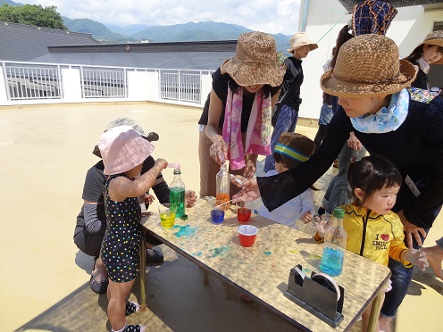 8月23・24日(火・水)は、屋上で「片栗粉」のとろとろ絵の具で色遊びをしました。