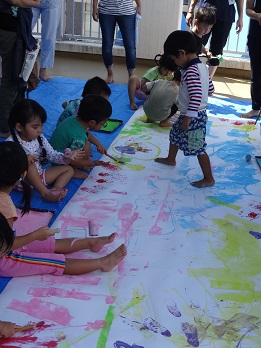 大きな紙に、ローラーや筆でらくがきしたり、手形や足型をペタペタ付けて楽しみました。