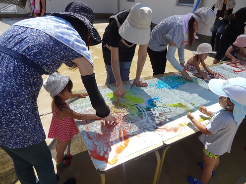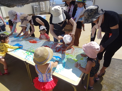 9月6・7日(火・水)はベランダで絵の具あそびを楽しみました。