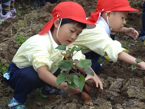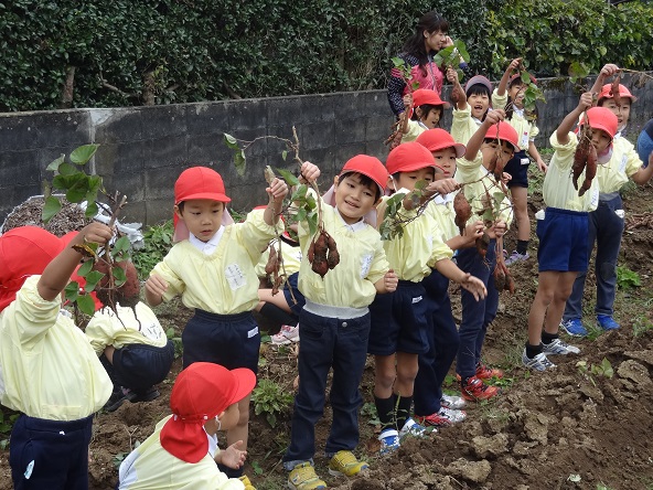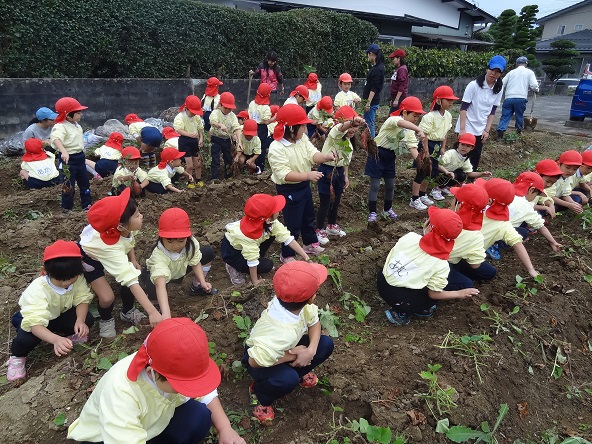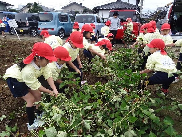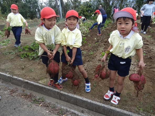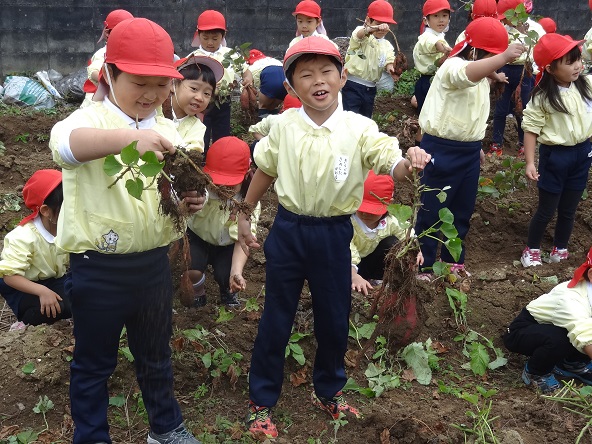 10月25日(火)、苗を植えてから育ててきたさつまいもを掘りに、年長さんが上郷にある芋畑まで出かけていきました。