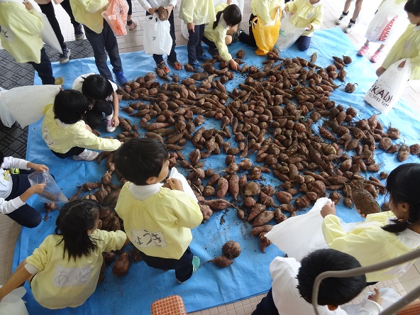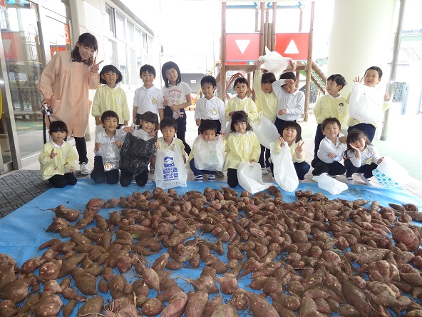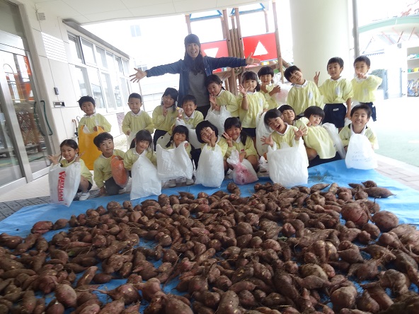 たくさんのお芋と記念写真。その後、年長さんは一人2個ずつ持ち帰りました。