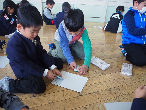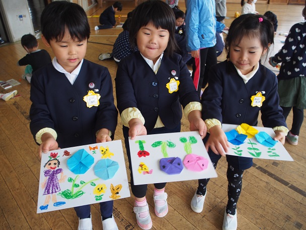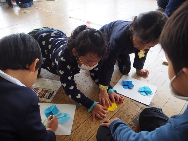 円筒校舎の3階に集合した年長さんと1年生。1年生の中には3月に卒業した顔見知りのお兄さん・お姉さんもいて、親しみを持って折り紙を教えてもらいました。