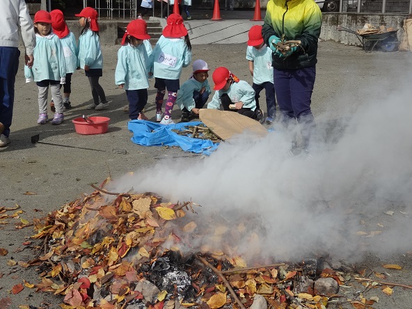 年長さんが山へ取りに行ってくれた枯枝を炊き、その中へお芋投入! 枯葉をかけて・・・
