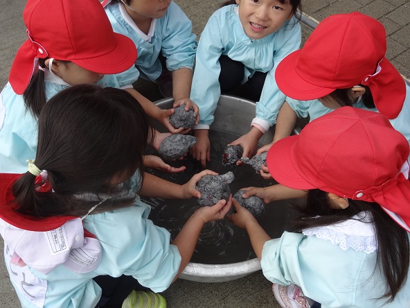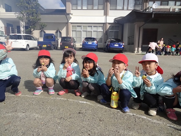 11月11日(金)、年中さんと未満児さんが園庭で焼き芋をしました。