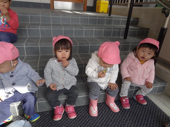 出来上がった焼き芋をほおばる1歳児さん。「熱いから少しずつね。」と先生に言われても「もっとちょうだい。」とたくさん食べました。