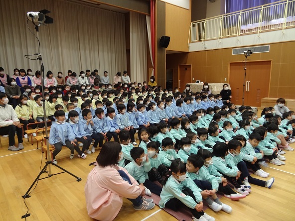 遊戯室に2歳以上の園児が集まり、人形劇を楽しみました。思わず吹き出しちゃったり、笑ったり・・・。