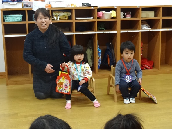 未満さんは3歳になったお友だちと2歳になったお友だちの二人。プレゼントをもらってちょっぴり緊張気味。