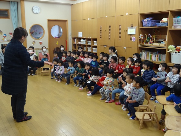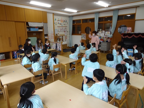 以上児さんは遊戯室で集会。6歳1人、5歳6人、4歳7人 合わせて14人のお友だちがお祝いされました。