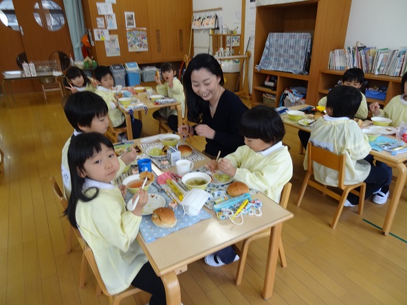給食では子どもたちの中に入って、一緒に給食をいただきながら食事指導をしていただきます。自分の子どもだけでなく、大勢の子どもたちにかかわる保育参加に。