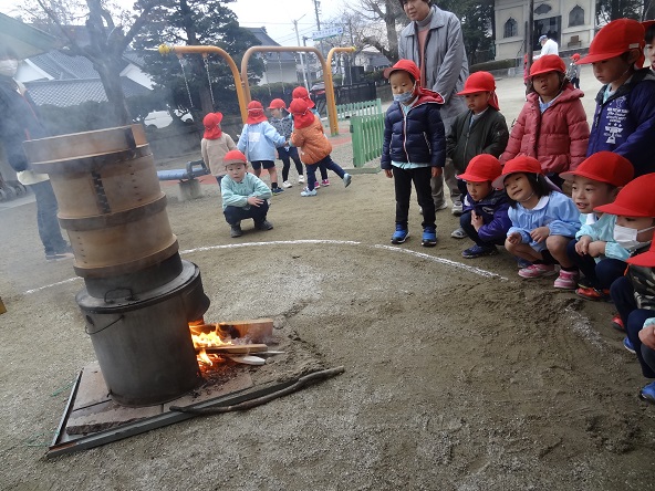園庭に設置された「かまど」。まきで火をおこし、蒸籠で餅米を蒸し上げます。湯気から漂うお米の蒸される臭いと、まきの煙の臭い。子どもたちは臭覚も働かせ、興味を持ってじっと見ていました。