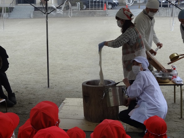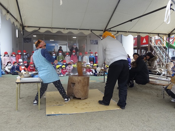 全部で6臼つきました。お餅はこの日の給食です。あんこ・きなこ・ごま の3色餅となり、子どもたちはおいしくいただきました。