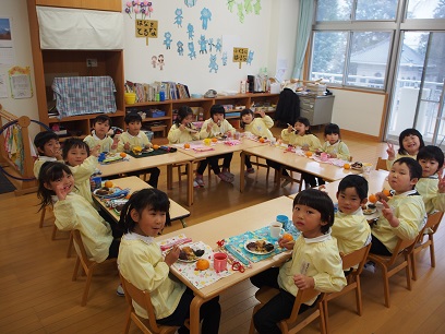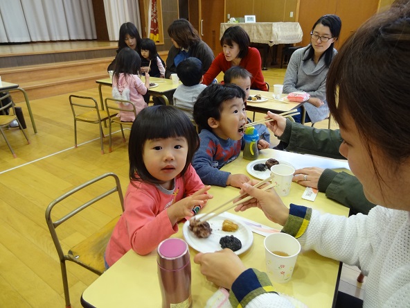 未就園の「さくらんぼさん」もお母さんに小さくしてもらい、つきたてのお餅をいただきました。外は寒かったので、遊戯室に入っていただきました。