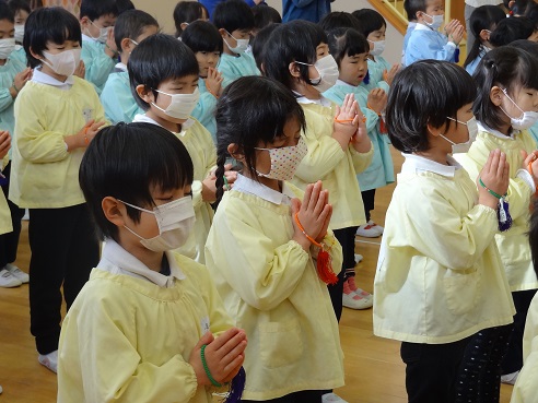 黙想・礼拝 みんな上手にできるようになりました。年長さんは手を合わせ、自分の心と向き合います。