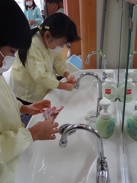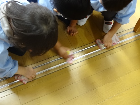 真っ黒だったドアのレールがピカピカに!! 汚れた雑巾は綺麗に揉み出してまた使います。年長さんにとっては小学校を前に、掃除を覚えていく良い機会となったようです。