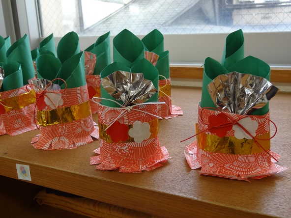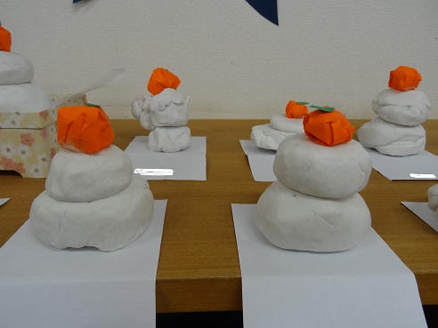 大掃除が終わり、新年を迎える準備です。年長さんは門松を手作りしました。年少さんでは、鏡餅を粘土で作って飾ったようです。