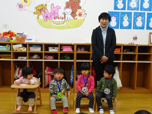 1月16日(月)、1月の誕生会がありました。朝から雪の舞う寒い日でしたが、みんなで集まって一つずつ大きくなったお友だちをお祝いしました。