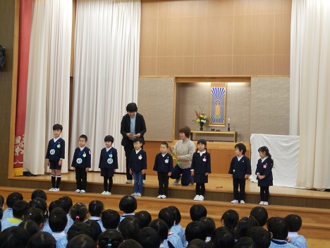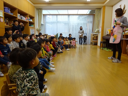 未満のお友だちは4人。園長先生にペンダントをかけていただきました。アトラクションはエプロンシアターを楽しみました。