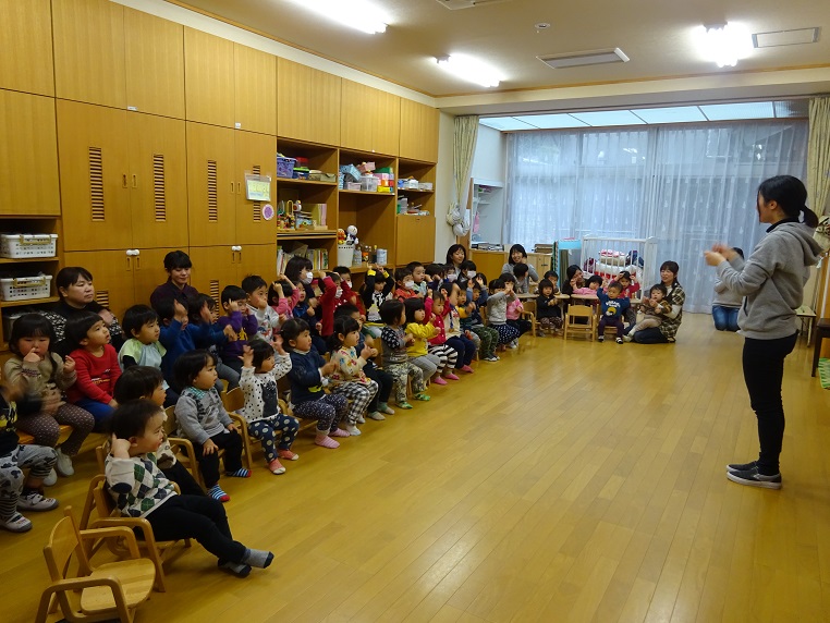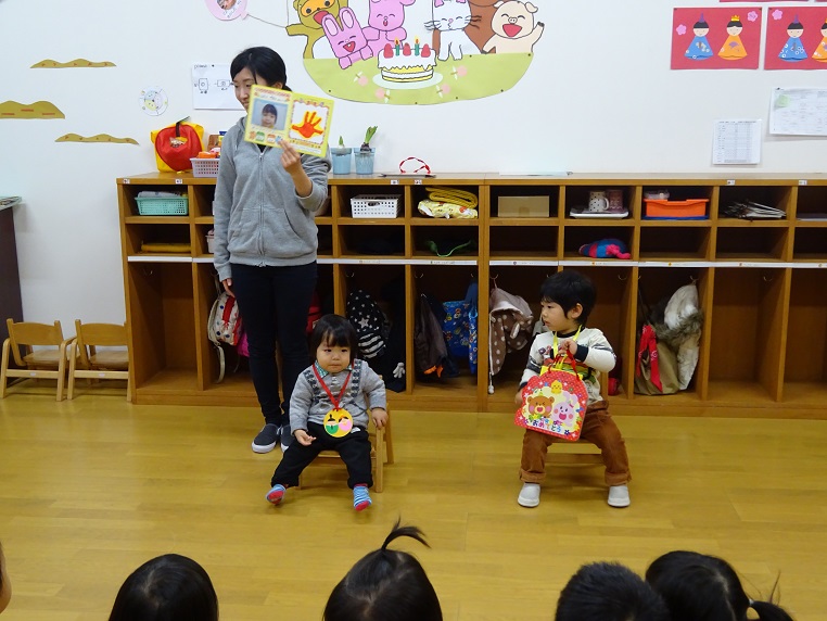 未満児の誕生会、今月は二人。いつものように手遊びをしたり、プレゼントをあげたりして誕生会を過ごしました。でも、違うのは随分と皆が落ち着いて参加できるようになったことです。