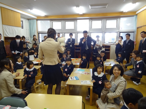 年長さんの代表のお友だちから、お祝いの後挨拶もいただきました。その後、アトラクションの年長や年中の先生方による劇を見て楽しみました。