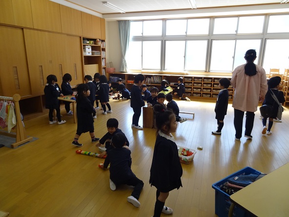 新しい保育室・新しい担任の先生、ドキドキして登園してきた子どもたちも、すぐに遊び始めていました。