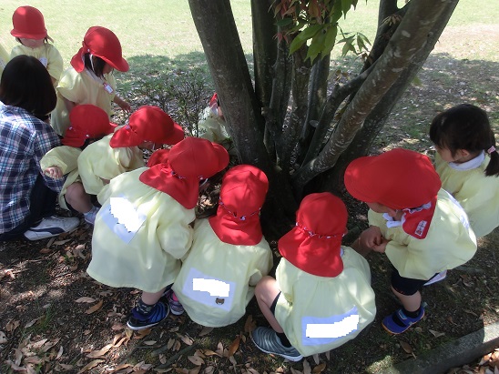 「みんな集まってなにしてるの?」「かえるがいたの。」みんなが追いかけたら、側溝の中に飛び込んでしまったようです。それでもじっと見続ける子どもたち。