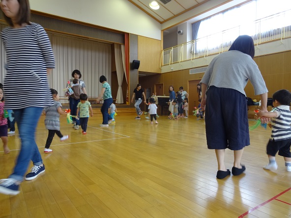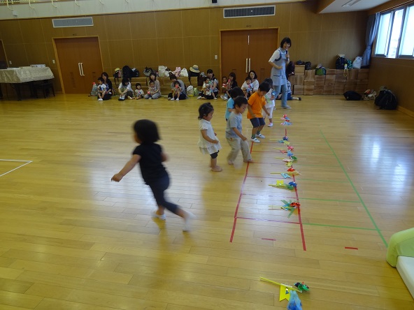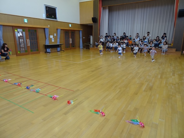 その後遊戯室に戻り、さくらんぼさんだけのこいのぼり運動会ごっこは「こいのぼりひろい」のかけっこです。「よーい、どん!」のかけ声に一人で走り出せるお友だちがたくさんいました。