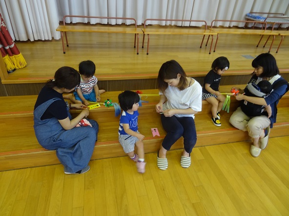 こいのぼりを拾ったら、お母さんのところまで見せに走ってもどります。拾ったこいのぼりに、うろこのシールを貼りました。この一手間で、こいのぼりが「自分で作った、ぼくの(わたしの)こいのぼり」になりました。
