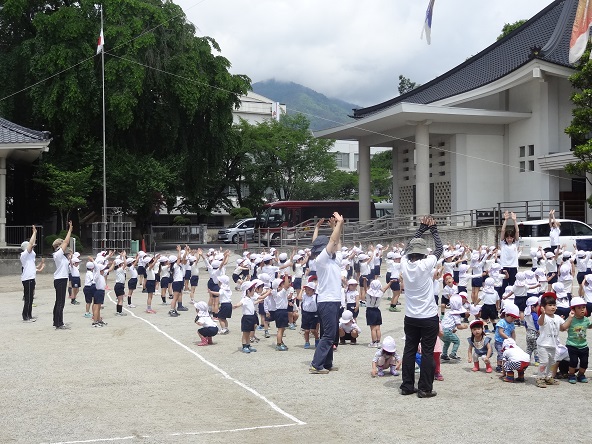 年中・年長は整列して、年少と2歳児は園庭に広がっての自由体系で、全園児による「はとぽっぽ体操」。