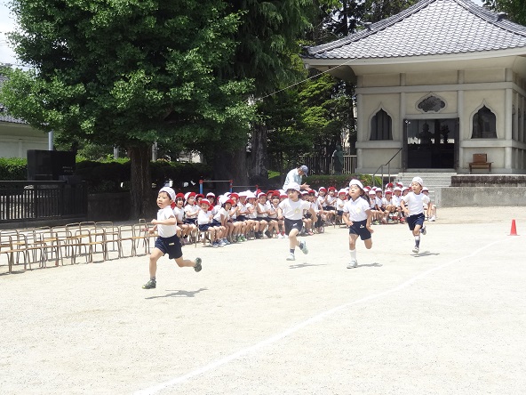 年長さんは「跳んで、回って、ゴー」のかけっこです。マットで前転、大急ぎでくるっと立ち上がれるかな?年少さん・年中さんの応援を受けて頑張りました。