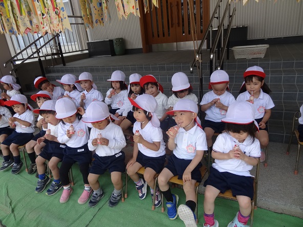 「空を泳ぐこいのぼりのように、力いっぱい運動しましょう!」と、年長さんの挨拶にあったように、しっかり体を動かしたこいのぼり運動会。終了後はおやつの飲み物をいただきました。