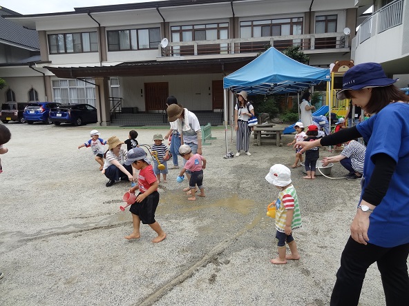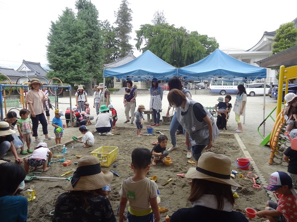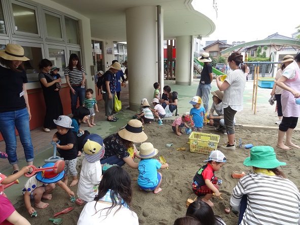 27日(火)は曇り空ながら時々薄日が差す天気で、予定通り砂場を中心とした、庭での泥んこ・水遊びができました。