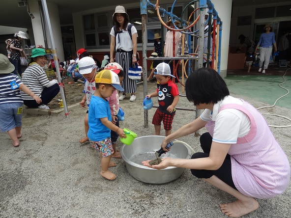 庭に流した水からできる川作りを楽しんだり、砂場で型抜きや穴掘り・お山作りなどに夢中になる子どもたちでした。