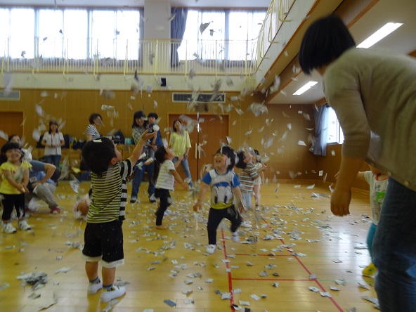 細かくちぎった新聞紙に子どもたちは夢中。両手を広げて受け止めようとしたり、全身で紙吹雪の中を跳ね回ったりして楽しんでくれました。そして、いつものようにおやつをいただきました。子どもたちにも、少しずつ打ち解けてきたような雰囲気が見られ、とても嬉しいです。