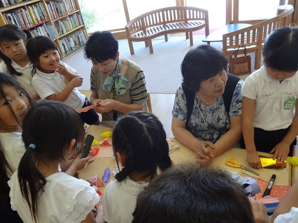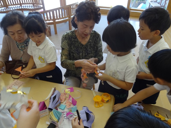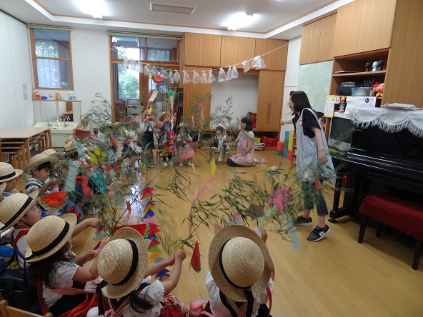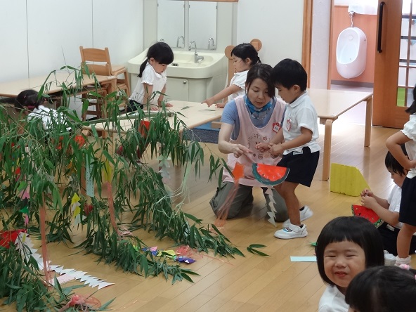 7月7日には橋北地区の皆さんも七夕まつりに来て下さり、年長児と一緒に笹飾りをつくって下さいました。自分たちも作った飾りなので作り方を覚えていて、地域の方に教えてあげたり、お手伝いしてあげたりしていました。