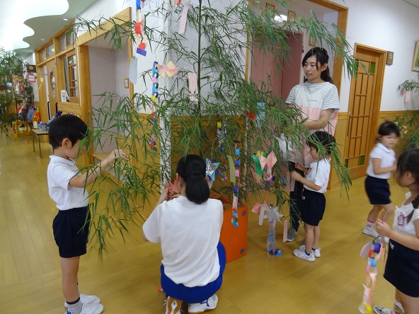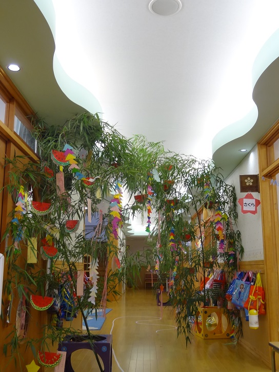 廊下やフリースペースなど、園内のあちこちに綺麗な七夕飾りがたちました。北玄関側の廊下は天井に明かりを入れるとまるで天の川のようで、笹飾りと共に素敵な空間になりました。
