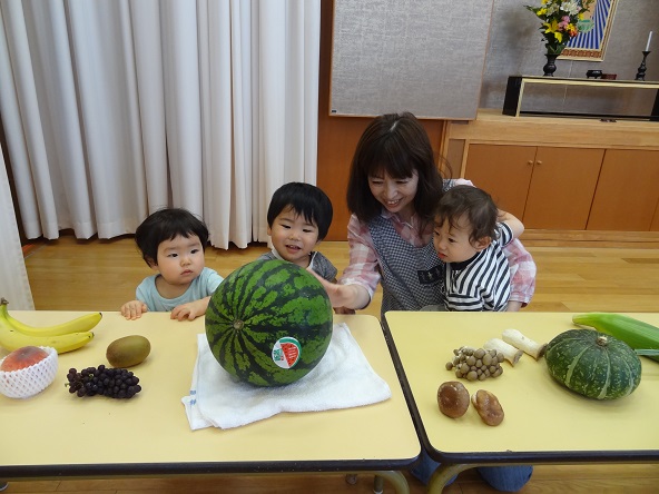 集会用に並べられた野菜や果物を見に、未満児さん達も遊戯室に来ました。自然の恵みに感謝する七夕の行事です。知っている果物や野菜に夢中になっていました。「ブドウ、こうやって一粒ずつ食べるんだよね。」真似っこする先生に目が釘付けの1歳さん。