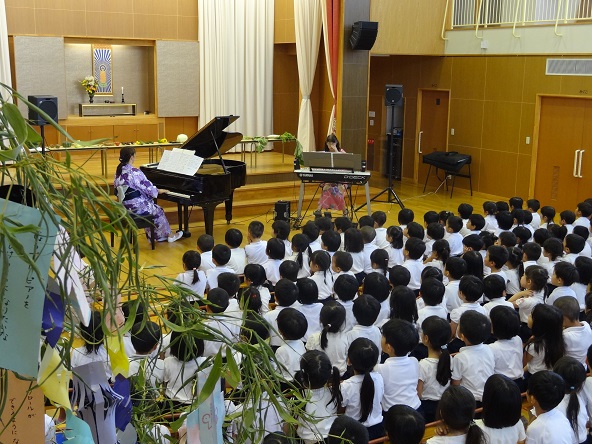 7月7日(金)、七夕まつりがありました。今年は「七夕コンサート」を開き、ピアノとエレクトーンの迫力ある演奏を聴きました。