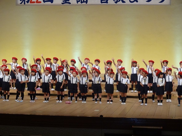 おそろいの赤いベレー帽をかぶり、大きなステージに立った年長さんは56名(この日の欠席は3名)。しっかりと歌い上げることができました。