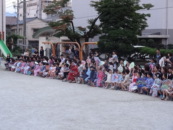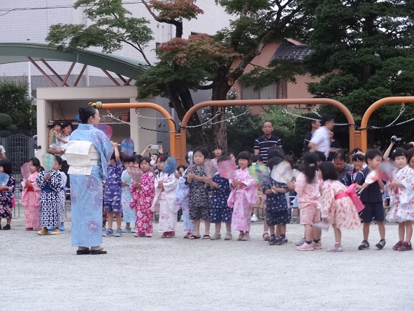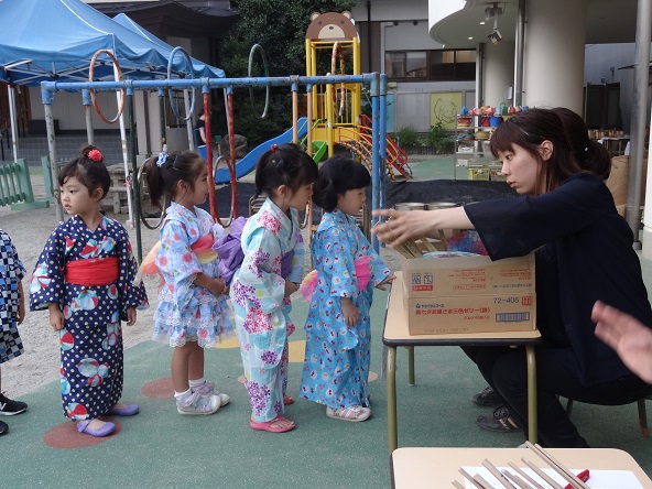 夕方の登園。いつもと違う浴衣姿で受付をする子どもたち。受付では自分たちで作ったうちわを受け取ります。