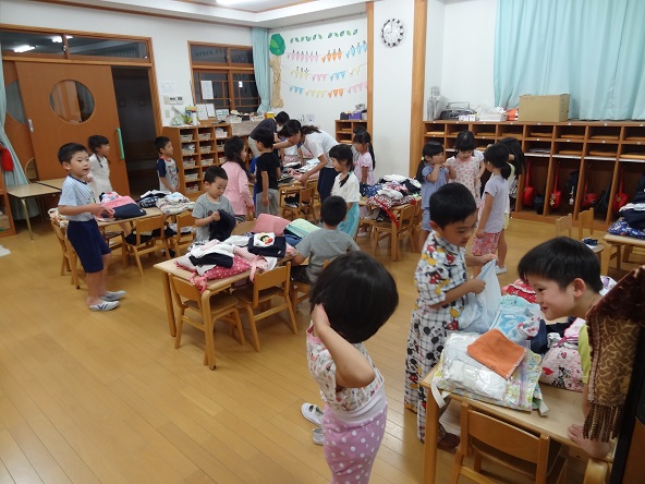 星は出ていたかな?夜の町の風景はどうだったかな? パジャマに着替えて寝る準備。脱いだ物はたたんで・・・全部一人でやります。