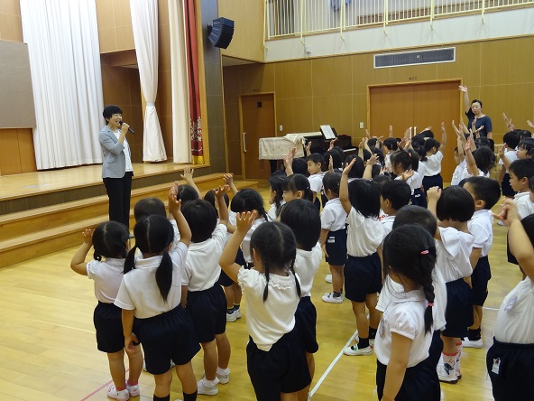 園長先生から夏休み中に「~(プール・お墓参り・おじいちゃんお婆ちゃん家に行った・お手伝いetc・・・)をやった人?」と聞かれるとあちこちでたくさん手が上がりました。