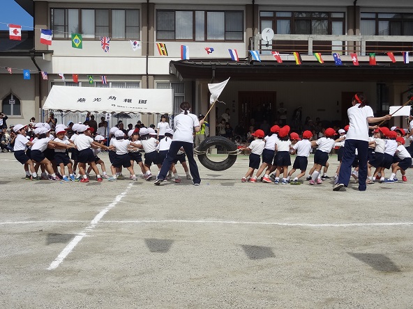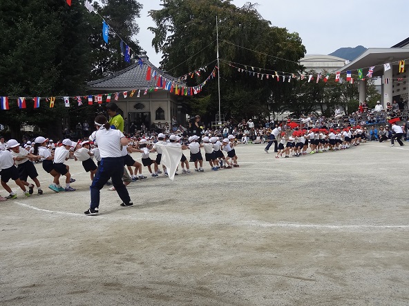 年長団体 つなひき 見ている方も力が入ります 同窓生のパン食い競争は園児の憧れの競技です